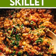 Steamy, saucy goodness! This Couscous Skillet is packed with vibrant flavors and freshness. Pearl couscous, tomatoes, chickpeas, spices, kale, and a bunch of fresh herbs and feta on top.